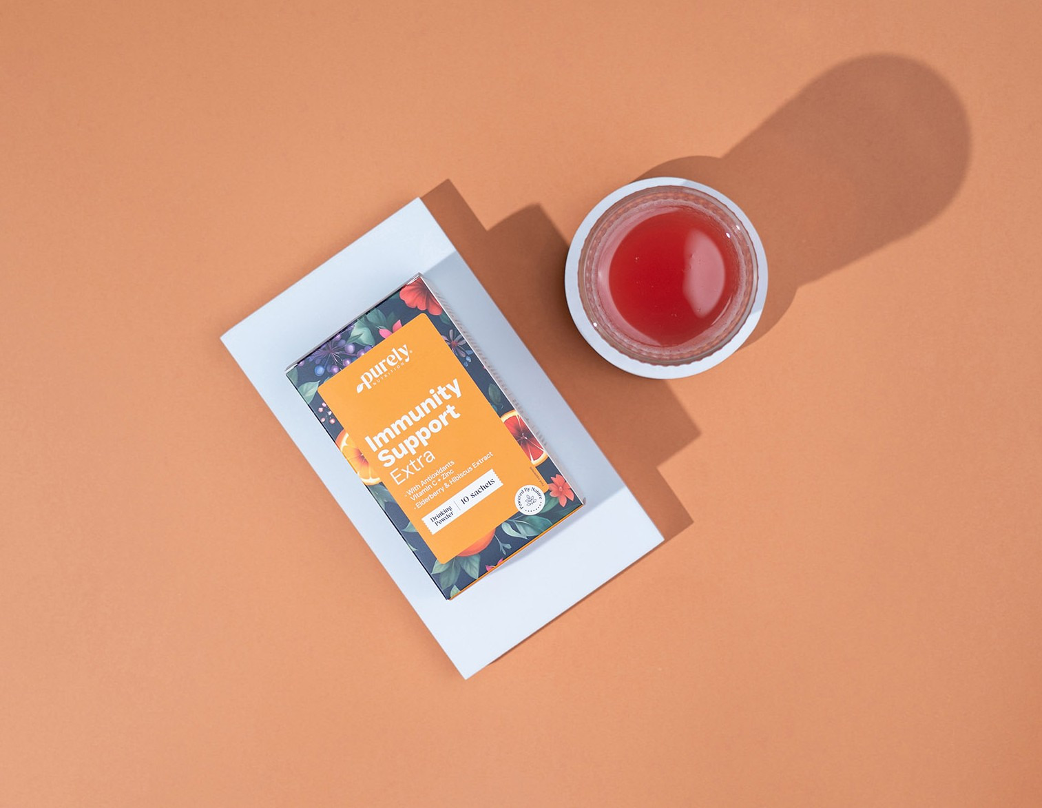 Zloženie: maltodextrín, kyselina L-askorbová (vitamín C), prášok z koncentrátu čiernych ríbezlí 5 %, prášok z koncentrátu malín 3 %, horečnaté soli kyseliny citrónovej, extrakt z bazy čiernej (Sambucus nigra) 2 %, extrakt z kvetov ibišteka (Hibiscus sabdariffa) 1 %, arómy, bisglycinát zinočnatý, protihrudkujúca látka: oxid kremičitý, sladidlo: sukralóza.